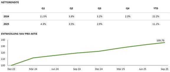Der Fonds startet ins vierte Quartal mit einer robusten Investment Pipeline, darunter die drei aktuell im Q4 geplanten Transaktionen in resiliente, hochwertige Unternehmen mit starkem Abwärtsschutz. Diese Chancen schaffen die Grundlage für ein starkes Jahresendresultat sowie eine attraktive Kapitalallokation und Wachstumsstrategie für 2026