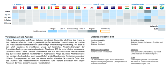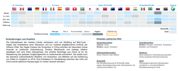 Die zyklische Analyse beginnt bei den drei größten Wirtschaftsregionen USA, China und der Eurozone, welche die globale Asset Allokation maßgeblich beeinflussen. Insgesamt werden in mehr als 20 Ländern weitere, oft idiosynkratrische Chancen verfolgt. Aus den Zyklusphasen der jeweiligen Länder werden die Chancen und Risiken in den Anlageklassen Aktien, Staatsanleihen, Inflation (inklusive Gold) und Währungen abgeleitet.